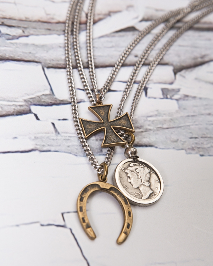 Vintage US Mercury Dime / Bronze Horseshoe Maltese Cross / Stainless Chain / 17-18.5" Adj. Length
