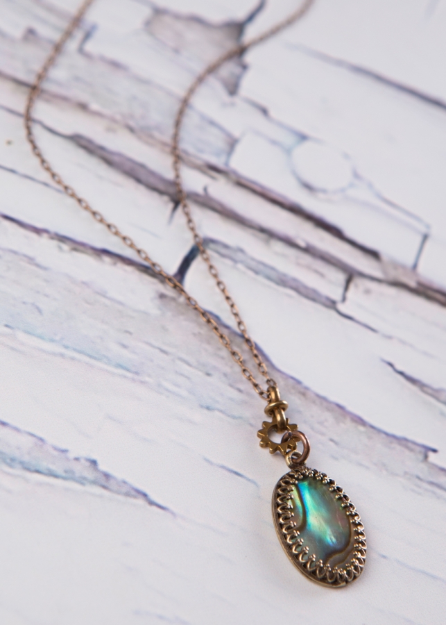 Abalone Cabochon with Gear Part Pendant / Brass Ox Chain / 16.5 - 18" Adjustable Length