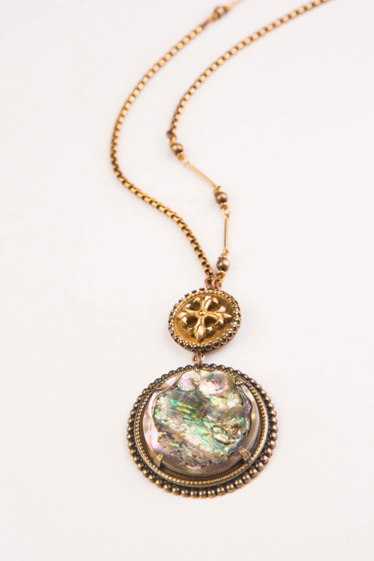 Vintage Maltese Cross Button / Abalone / Plated Gold Bronze Chain / 15-17" Adjustable Length