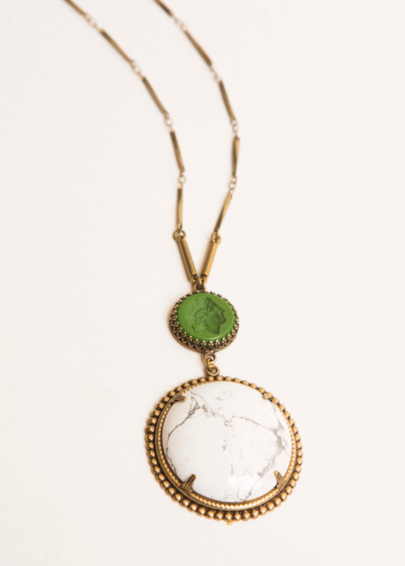 Vintage Green Intaglio / White Howlite Brass Ox Chain / 15.5-17.5" Adj. Length